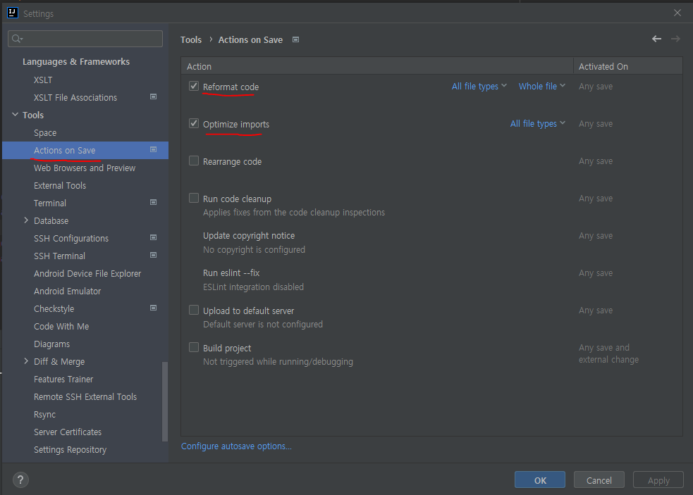 - Reformat code(저장 시 자동으로 포맷 적용)와 Optimize imports(저장 시 사용하지 않는 import 제거)를 체크한다.