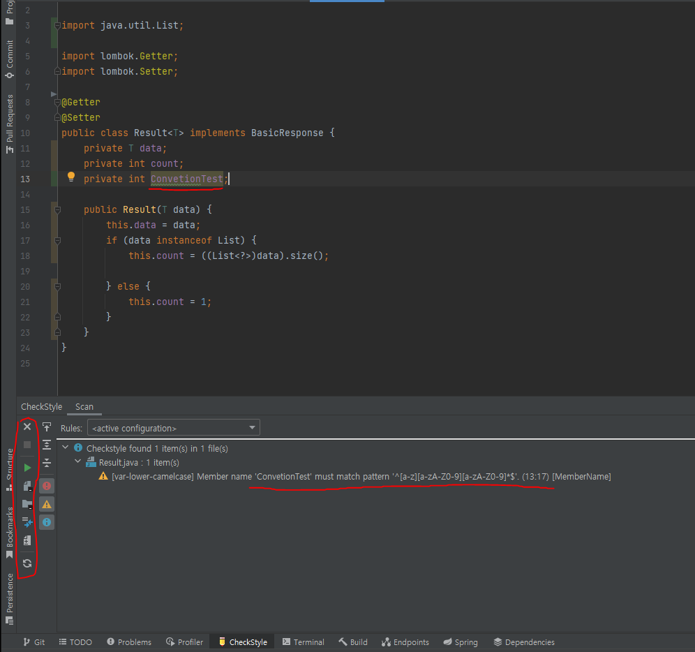 변수명에 소문자 카멜 케이스를 적용해야 한다는 컨벤션을 지키지 않자 CheckStyle에서 경고를 띄워주는 모습을 확인할 수 있다.
