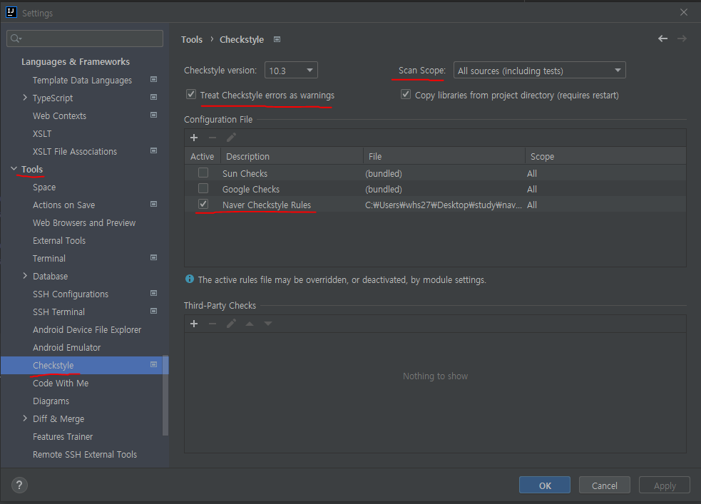 - File → Settings → Tools에서 Checkstyle 항목을 선택한다.